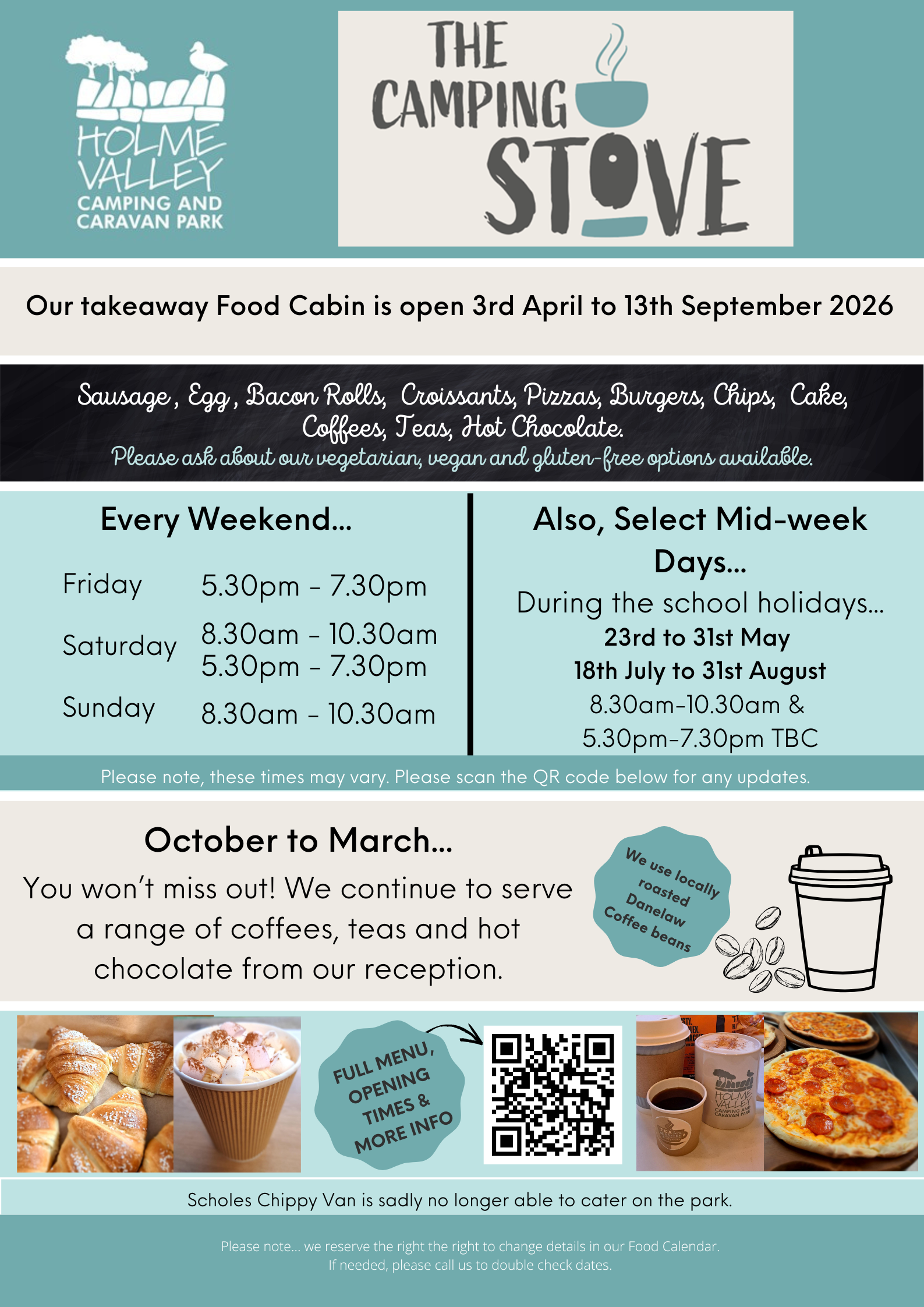 The Camping Stove takeaway food cabin is open from Easter until mid-September. We serve freshly baked croissants, together with sausage and bacon rolls to help you fuel for the day together with delicious rustic pizzas, burgers and chips in the evening. Please see click here for more details.